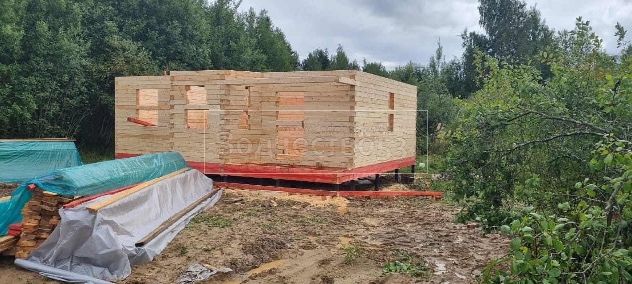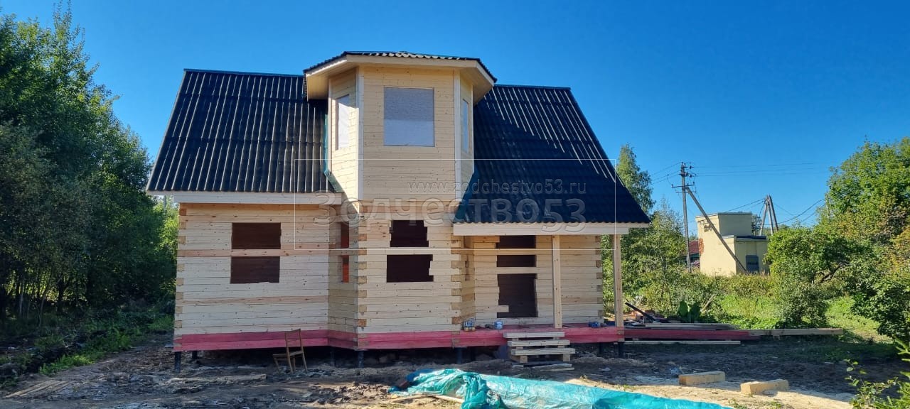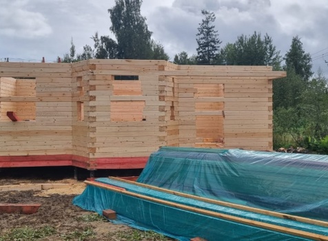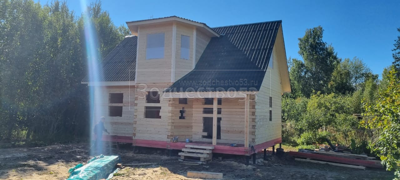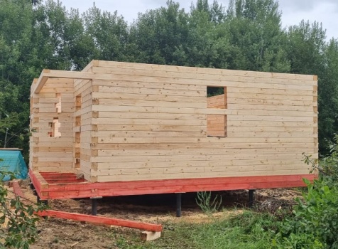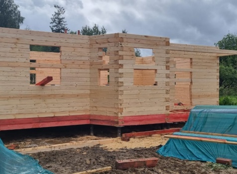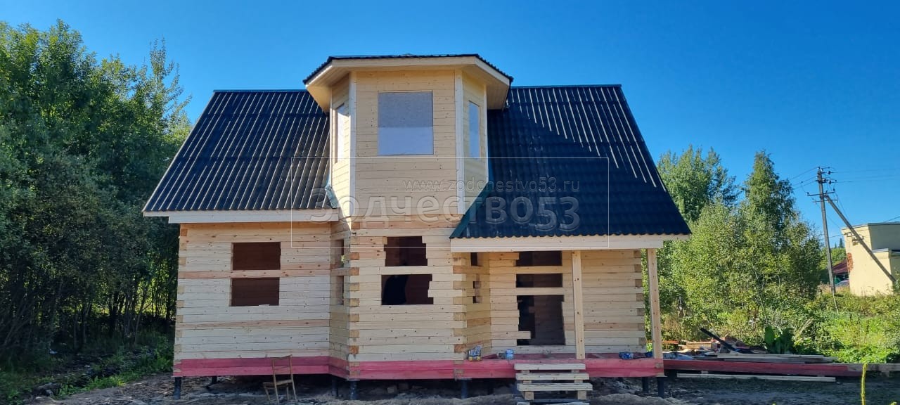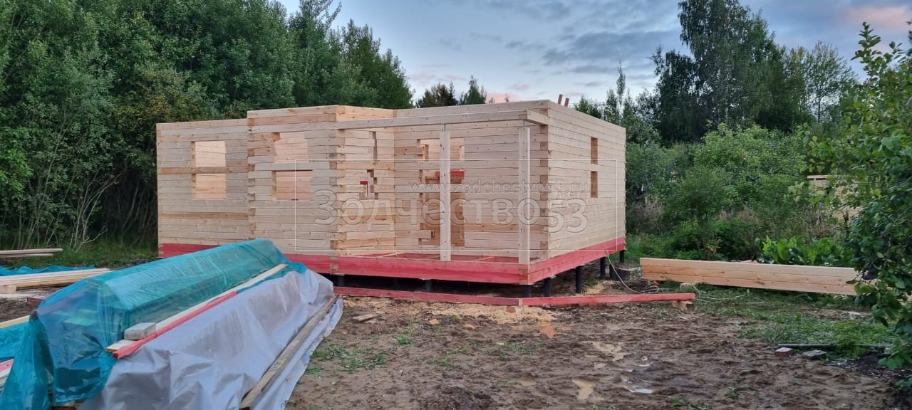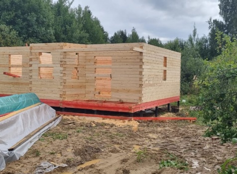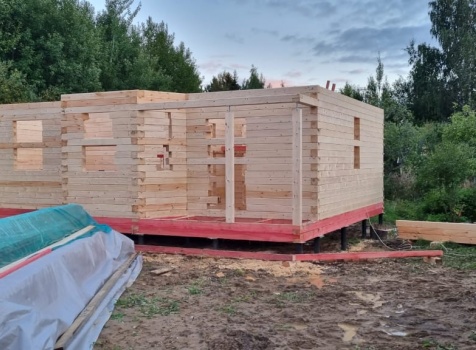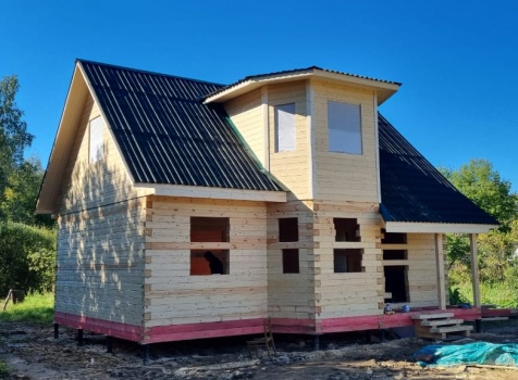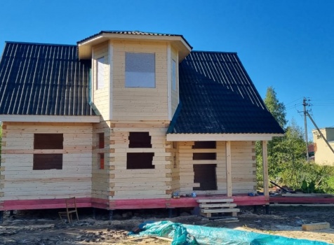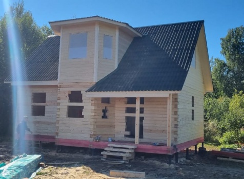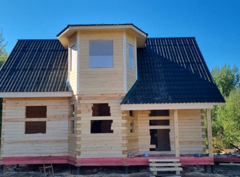 Постройка сруба дома общими размерами 7.0×9.0 (6.0×9.0 из профилированного бруса Естественной влажности 140×140 (прямой) и 1.0×3.0 крыльцо под общей двухскатной крышей с эркером 1.0×3.0 под отдельной крышей лучами ).