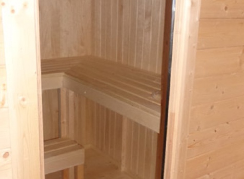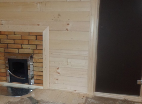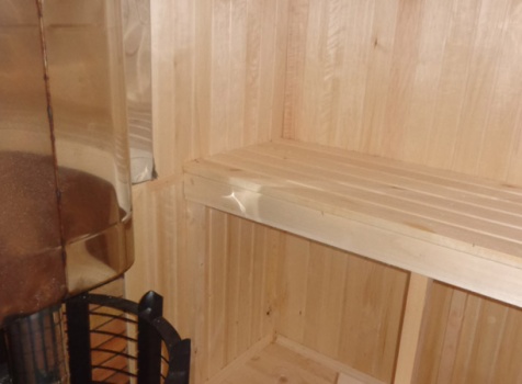 Парная обшита осиновой вагонкой с проложкой из фольги, установлены двухярусные полки.