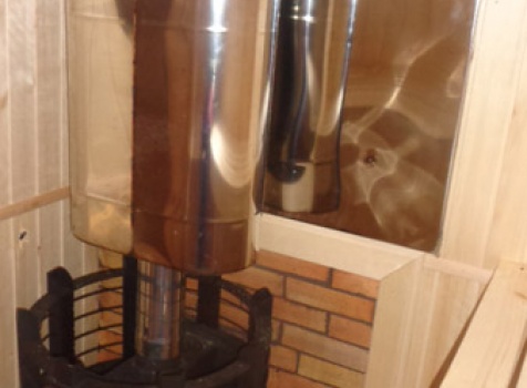 В парной установлена печь Ермак 16 ПС (сетка) с сендвич-трубами через крышу и с обложкой из кирпича + бак на печь 60 литров.