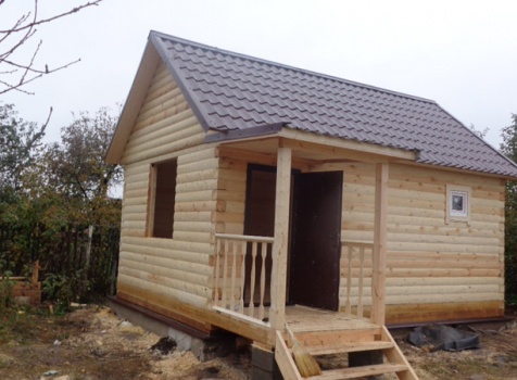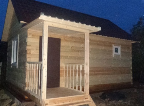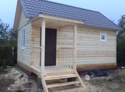 Одноэтажная баня 4×6 м. по проекту Дельфиниум из профилированного бруса 150×150 под двухскатной крышей и крыльцом 1.5×1.5 м. под отдельной крышей. Построена в Новгородской области, в селе Бронница