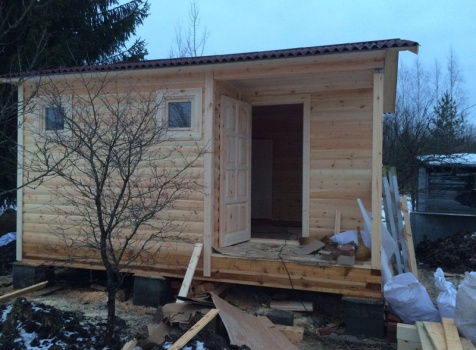 Одноэтажная баня размерами 5.0×4.0 из профилированного бруса 150×150 под двухскатной крышей со смещенным фронтоном. Построена: Ленинградская область, Тосненский район.