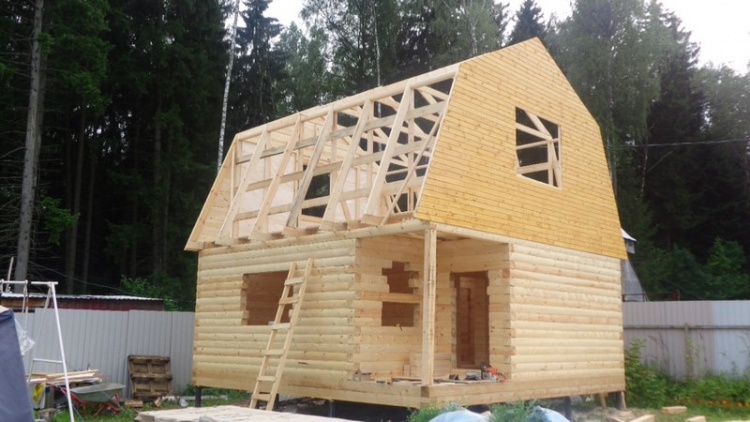 Баня из профилированного бруса 150×150 размерами 6×6 м. по проекту Крокус под ломанной крышей. Построена в Московской области, Дмитровском районе, п. Некрасовский