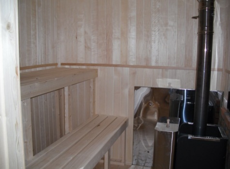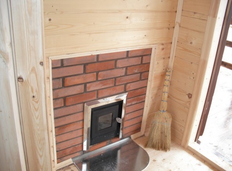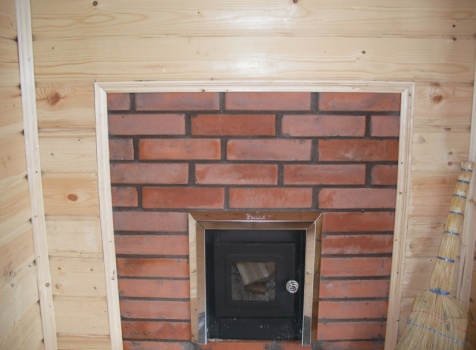Печь Ермак 12 «Элит» со стеклом, с сэнвич трубами, с обложкой печи из кирпича.