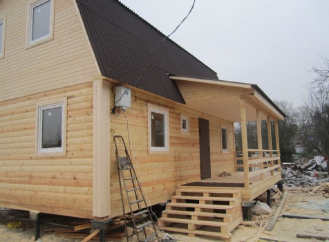 Дом 6×9 из профилированного бруса 150×150 под ломанной крышей с открытой верандой 2×3 под отдельной крышей (во время строительства дома заказчиком были внесены изменения по размерам веранды, веранда в итоге получилась размерами 2×4). Построен в ноябре 2014 г. в г. Санкт -Петербурге, Пороховые, Садоводство № 1.