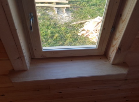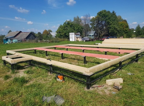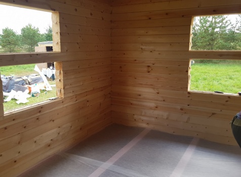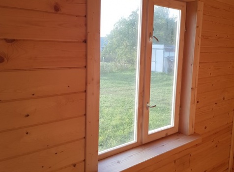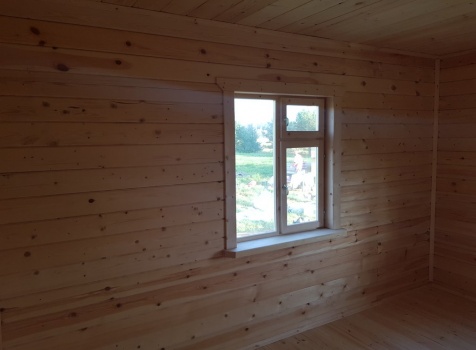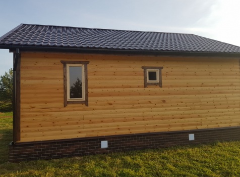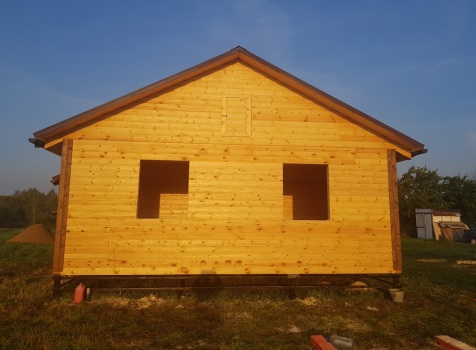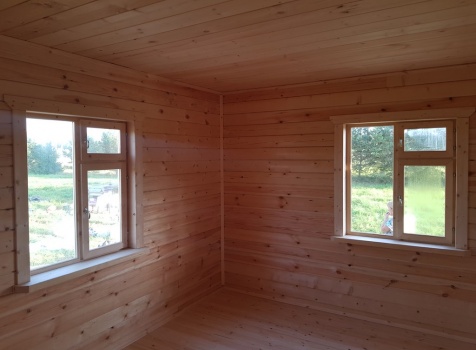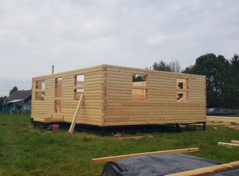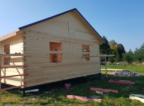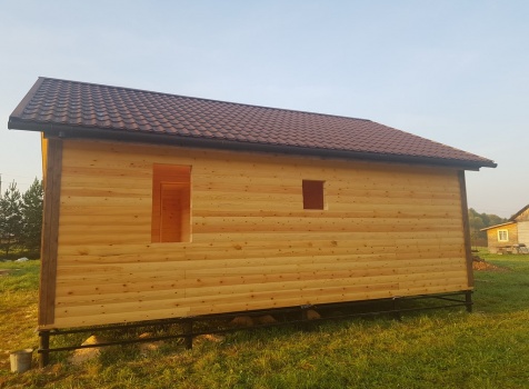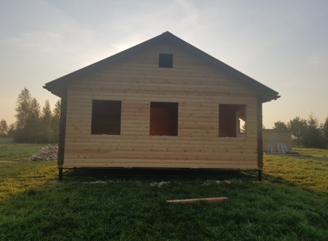 Одноэтажный дом общими размерами 7.0х8.0 из профилированного бруса 140х140 (камерной сушки) под двухскатной крышей и открытой террасой 1.50х1.0 м., под отдельной односкатной крышей. Объект построен: Московская обл., Можайский район, д. Шохово, д. 20б.