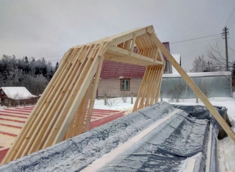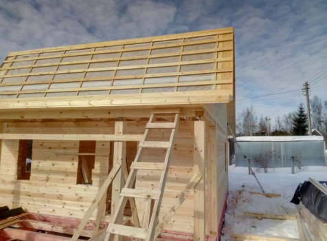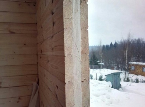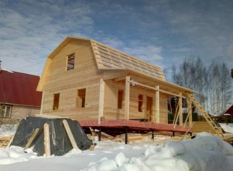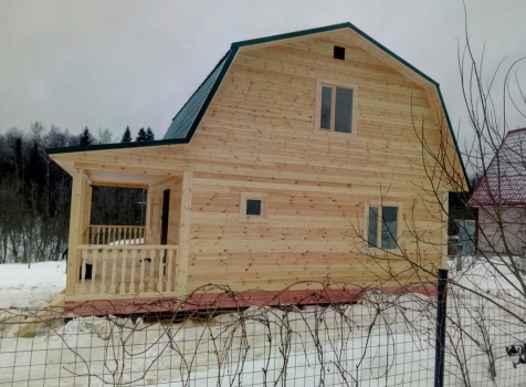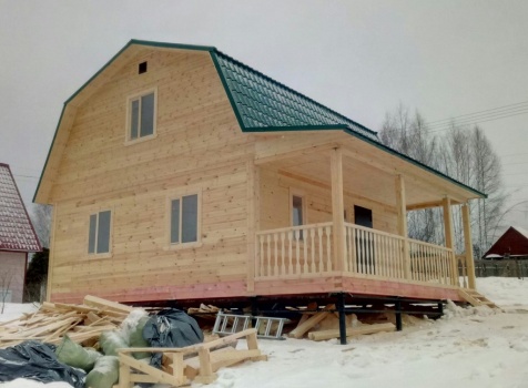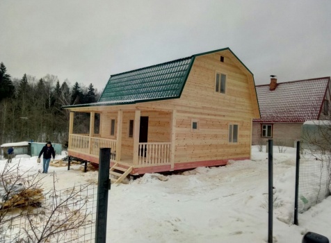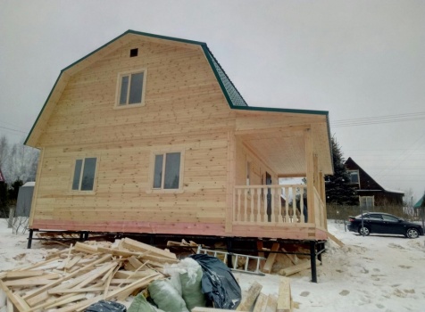 Дом общими размерами 7,0х9,0 (7,0х7,0 из профилированного бруса 150х150 под ломаной крышей и открытой террассой 2,0х7,0 под отдельной крышей). Построен в Московской области, Дмитровский р-н, Костинское с/п