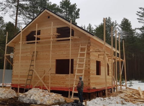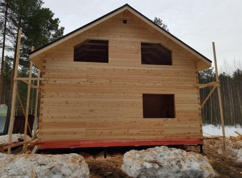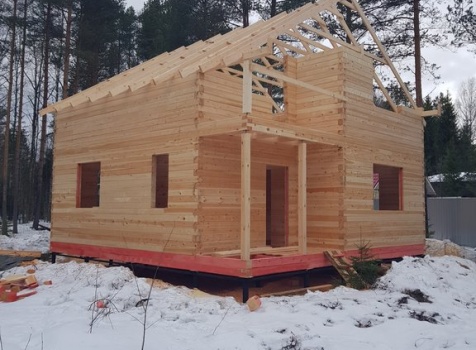 Полутораэтажный дом 8.0*8.0 из профилированного бруса 150*150 с брусовыми фронтонами под двухскатной крышей.