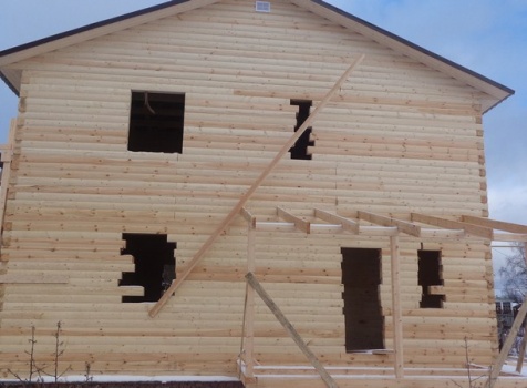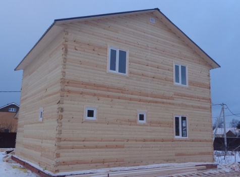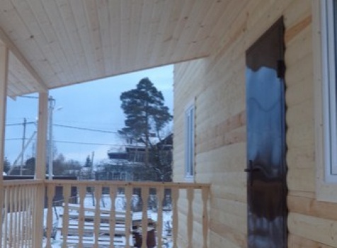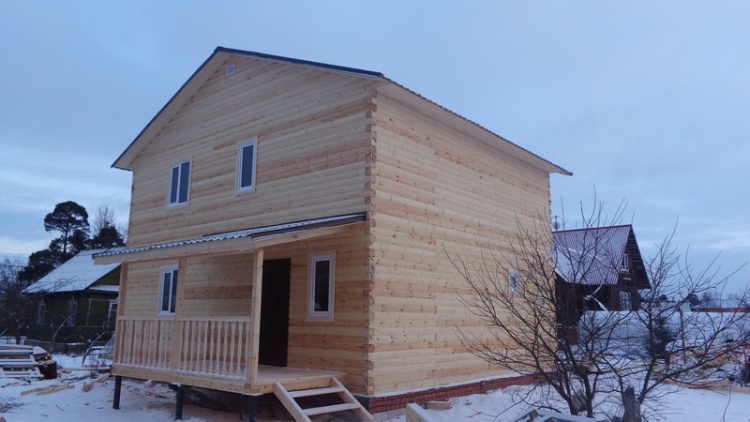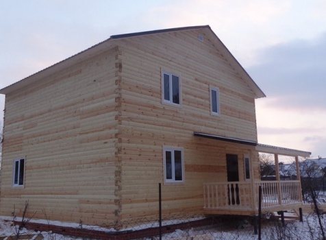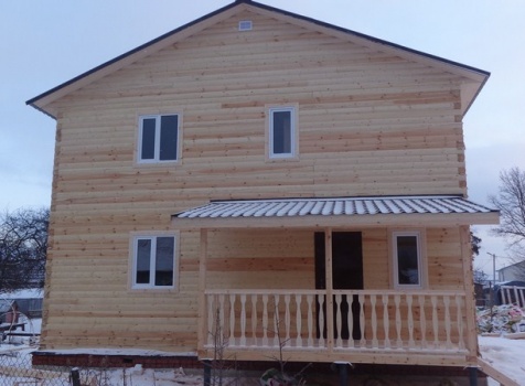 Двухэтажный дом общими размерами 8×9 из профилированного бруса 150×150 под двухскатной крышей и открытая терраса 2×4.5 под отдельной крышей. Построен: Ленинградская область, Тосненский район.