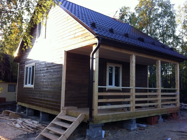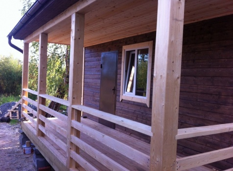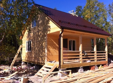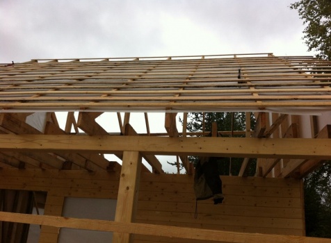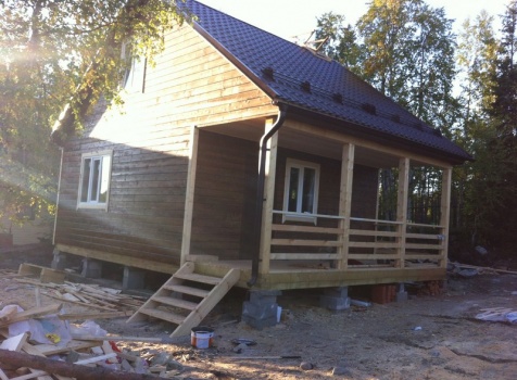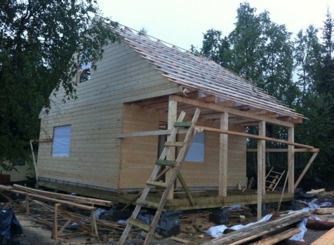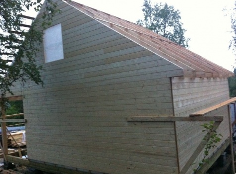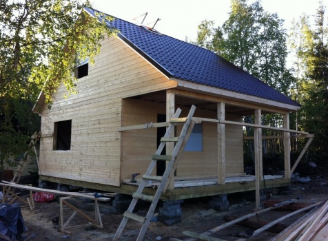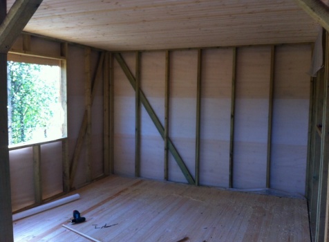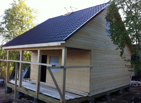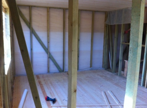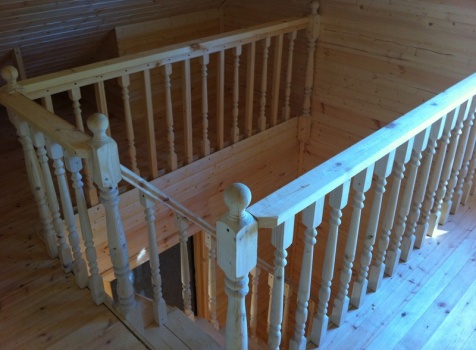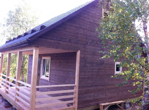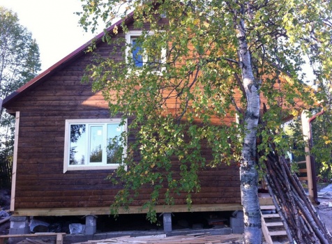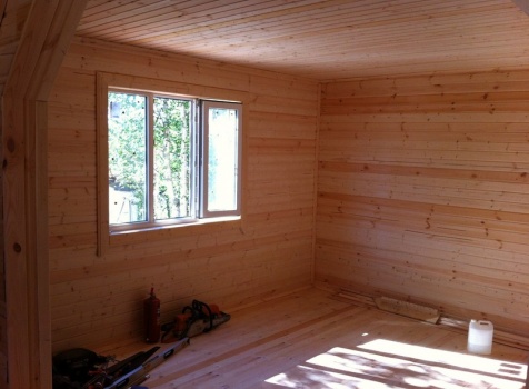 Стены первого этажа высотой 2.4 метра каркасно-щитовые, со сборкой на металлические углы и пластины, каркас из обрезной доски 40×100 с утеплением в 100 мм., ( Роквул) с двойной проложкой парогидроизоляции. Снаружи стены обшиты имтацией бруса, внутри — вагонкой 16 мм.