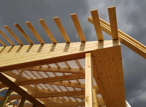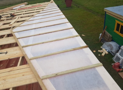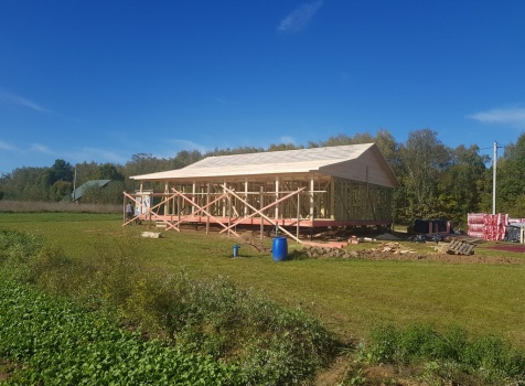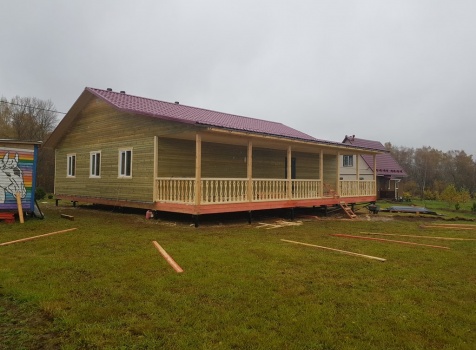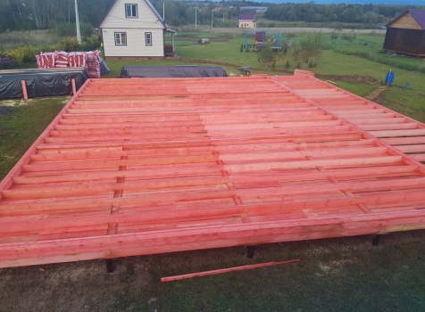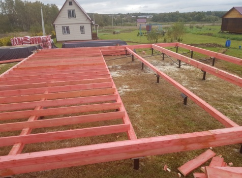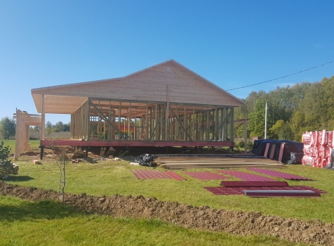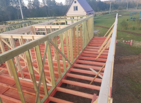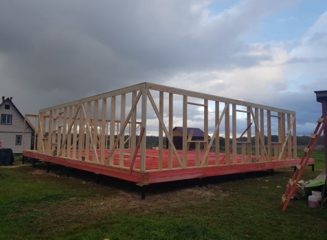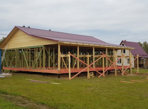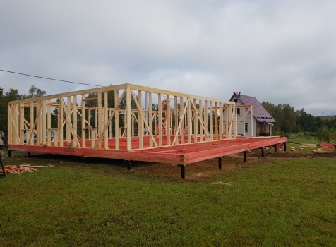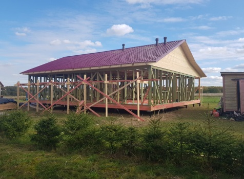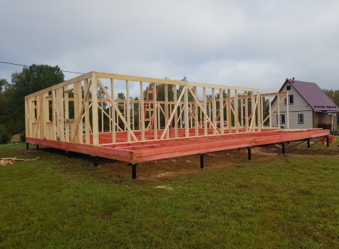Одноэтажный дом, общими размерами 14.0*12.50 (10.0*14.0 каркасно-щитовой, камерной сушки,под двухскатной крышей и 2.50*14.0 открытая терраса под отдельной односкатной крышей). Построен: Калужская область, Жуковский район, с. Совхоз Чаусово, ул. Пограничная.