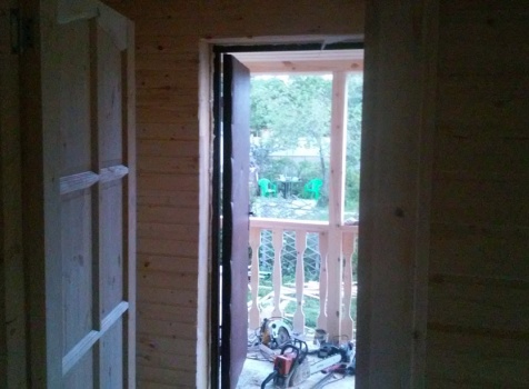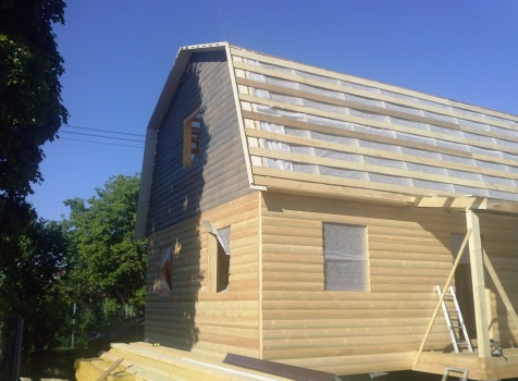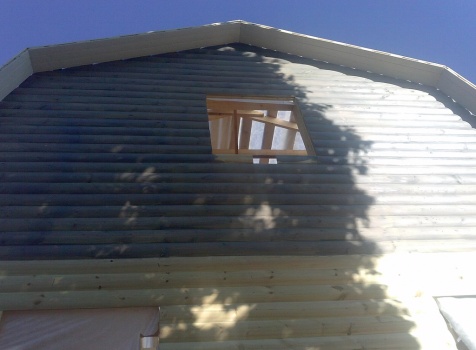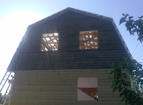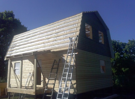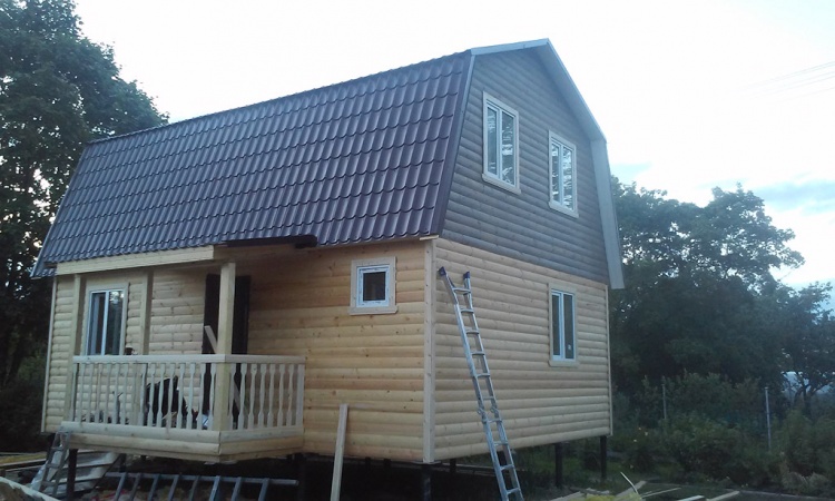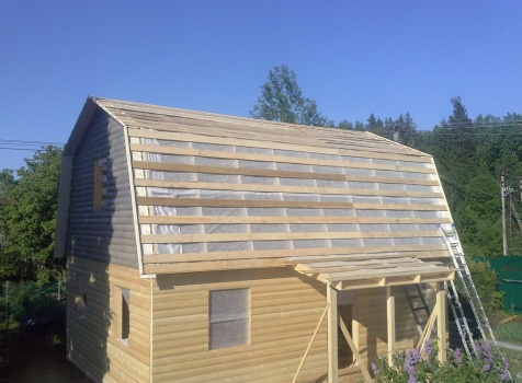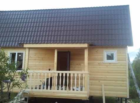 Каркасно-щитовой дом 6,0×8,0 под ломаной крышей, плюс крыльцо 2,0×1,5 под отдельной крышей. Построен в Ленинградской области, Гатчинский р-н, СНТ «Кобрино»