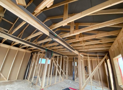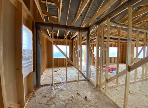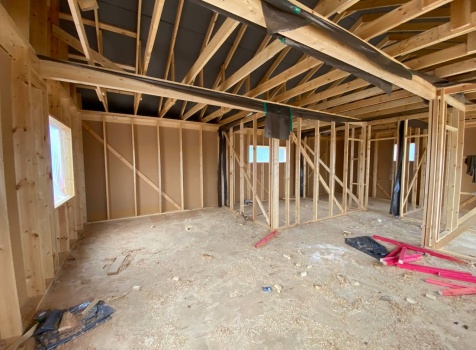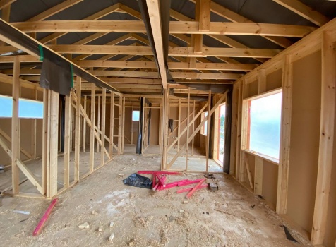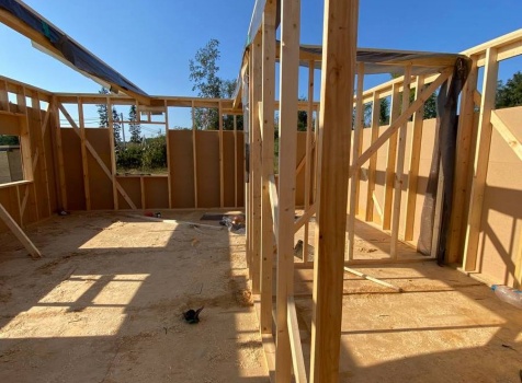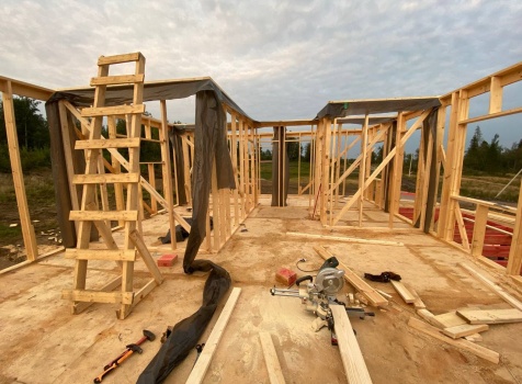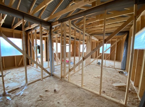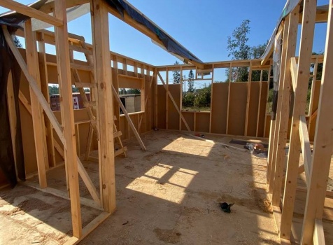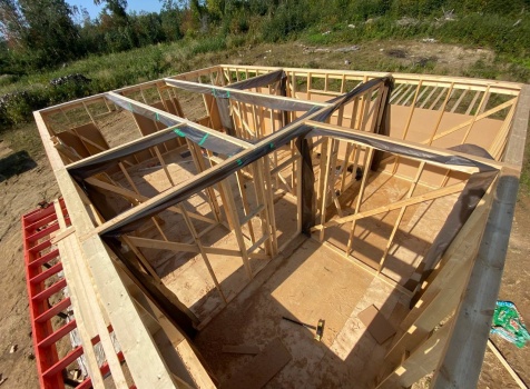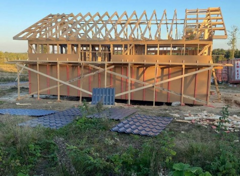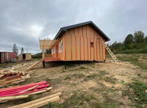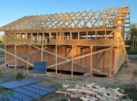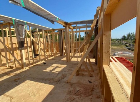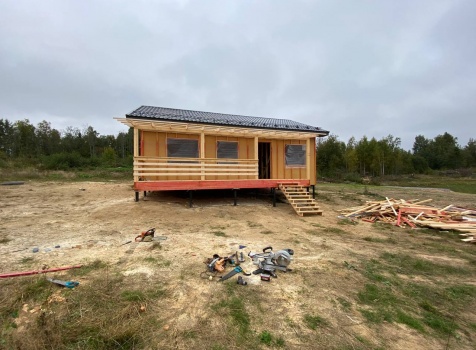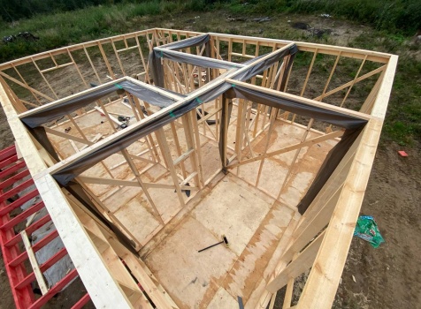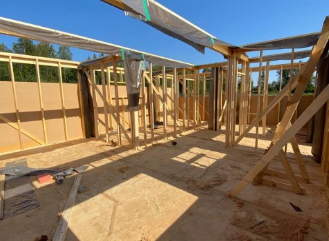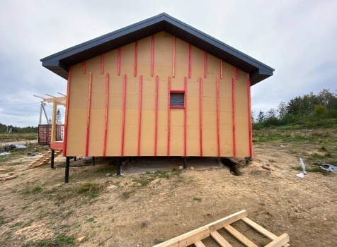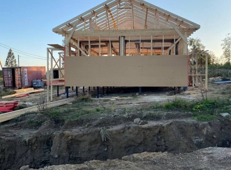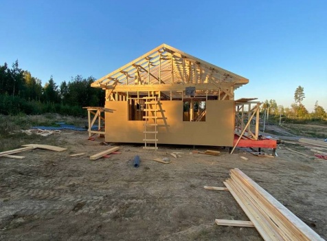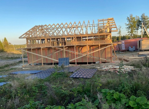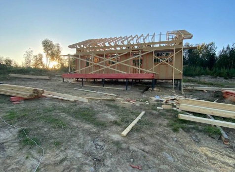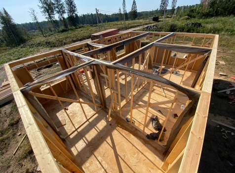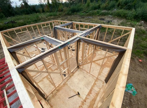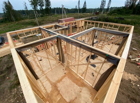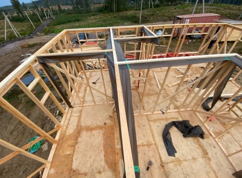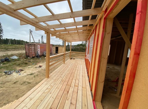 Постройка одноэтажного каркаса с открытой террасой ( с частичной отделкой ) общими размерами 8.0×9.0 ( 6.0×9.0 каркас ) каркасно-щитовой ( Камерной сушки ) под утепление в 150 мм (стены) под двухскатной крышей и ( 2.0×7.0 открытая терраса ) под отдельной односкатной крышей ( без кровли ) .