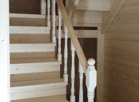 • Лестница: двухмаршевая с площадкой и точеными балясинами, стартовыми столбами и перилами .