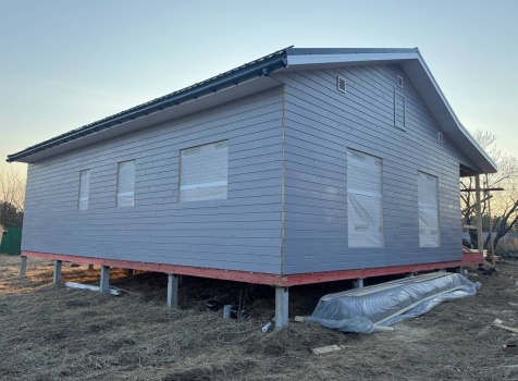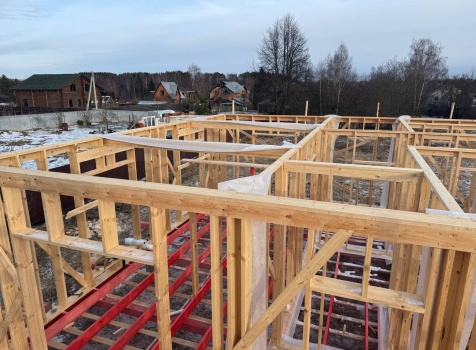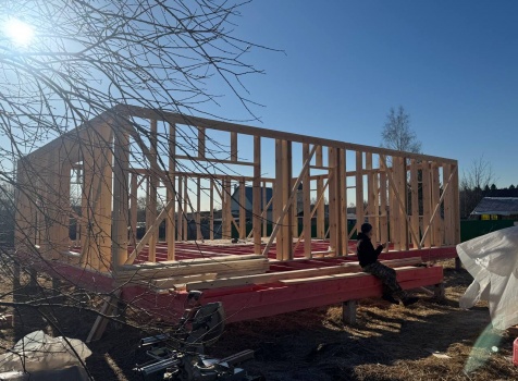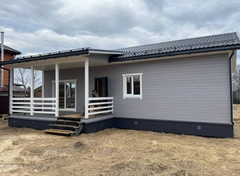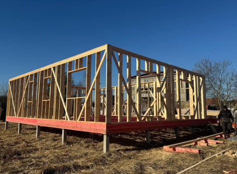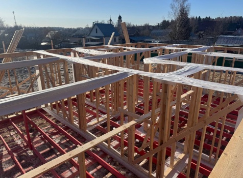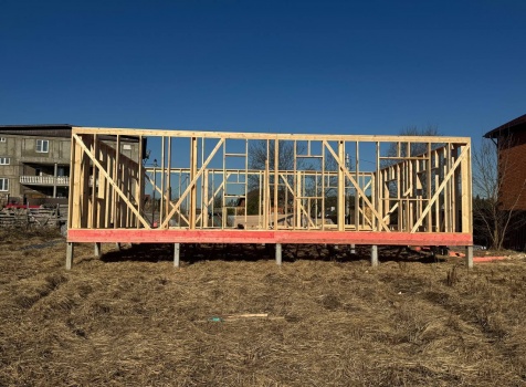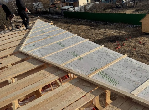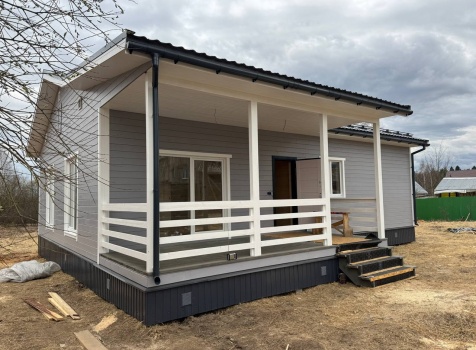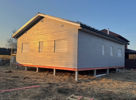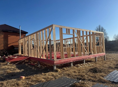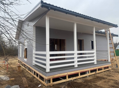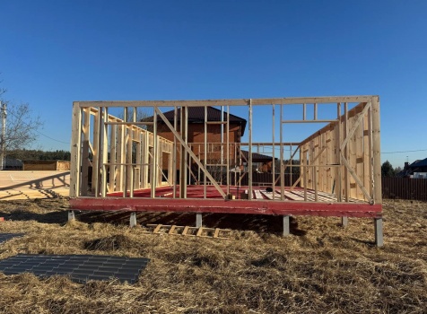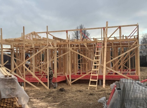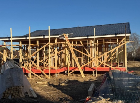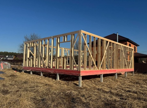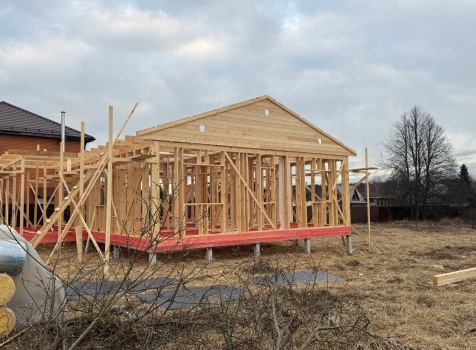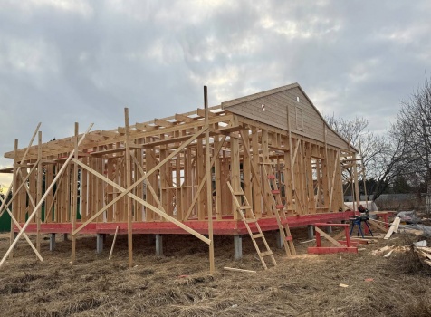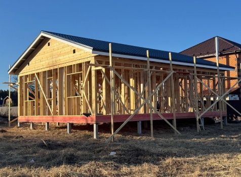 Постройка одноэтажного дома с открытой террасой общими размерами 12.0×11.50 ( 12.0×9.0 дом )каркасный (Камерной сушки) с утеплением в 200 мм (стены) под двухскатной крышей и ( 6.0×2.50 открытая терраса ) под отдельной односкатной крышей