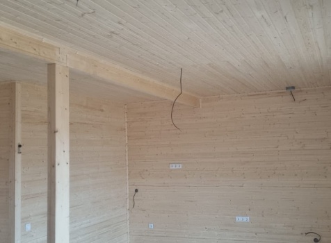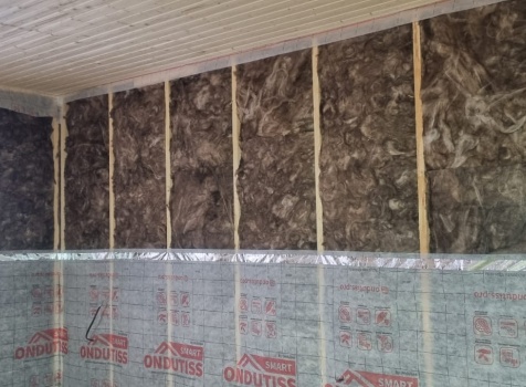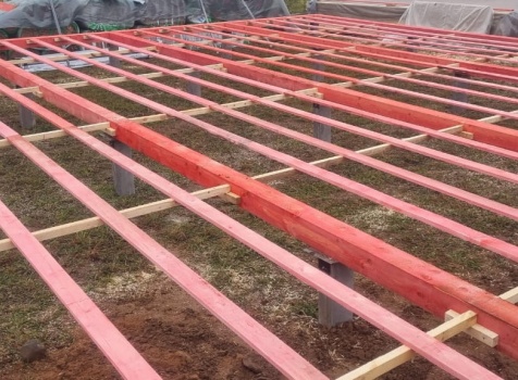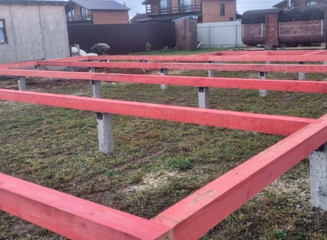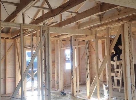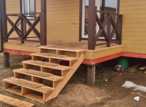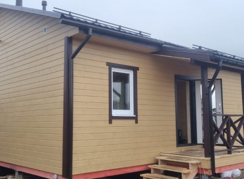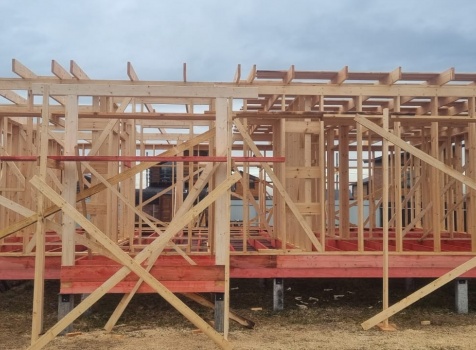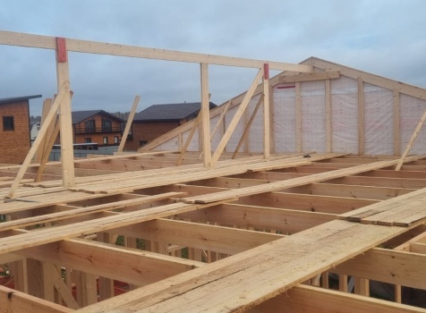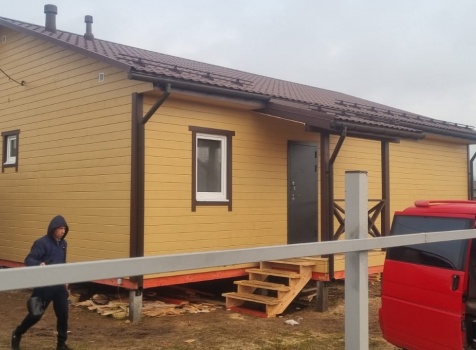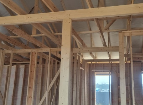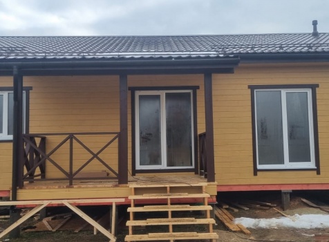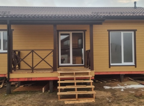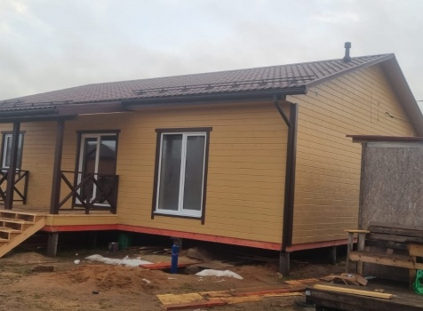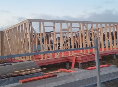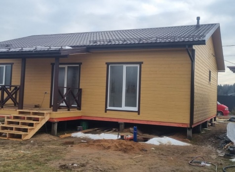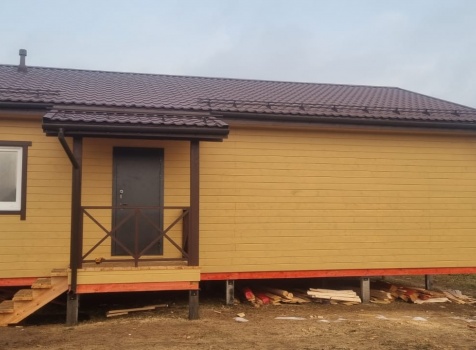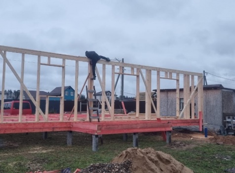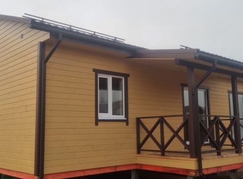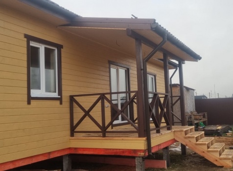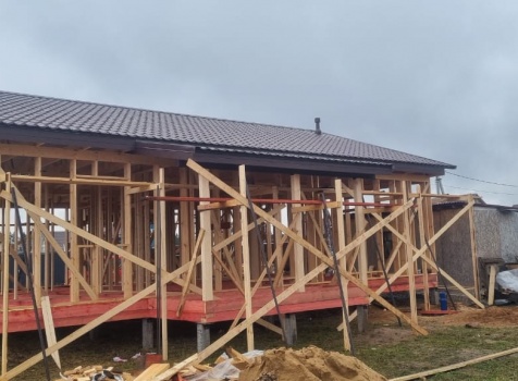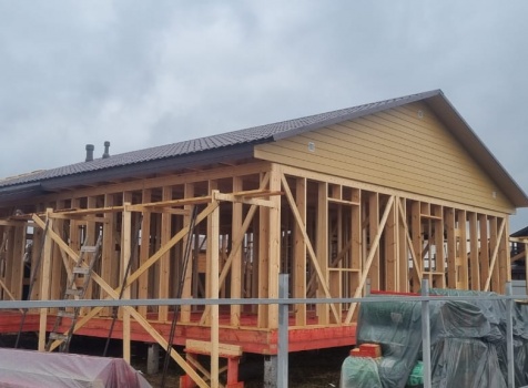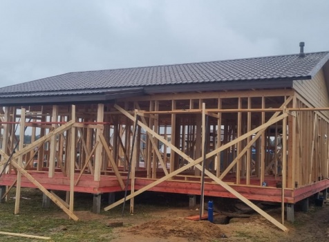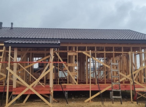 Постройка одноэтажного дома с открытой террасой и крыльцом, общими размерами 12.0×13.50 ( 12.0×10.0 дом ) каркасный (Камерной сушки) с утеплением в 200 мм (стены) под двухскатной крышей плюс ( 4.0×2.0 открытая терраса ) под отдельной односкатной крышей и ( 2.0×1.50 открытое крыльцо ) под отдельной односкатной крышей .
