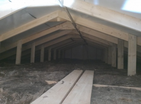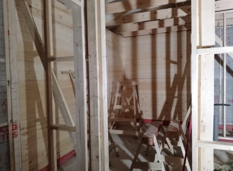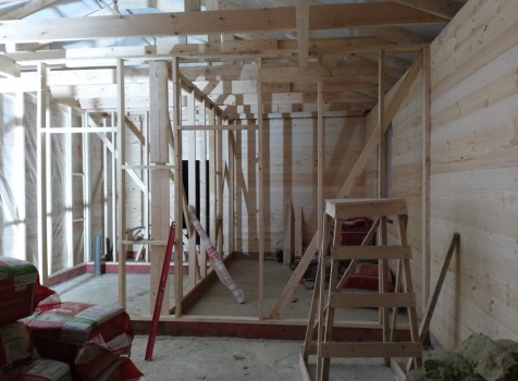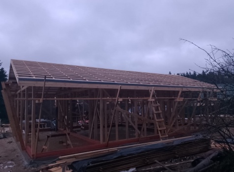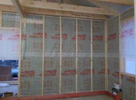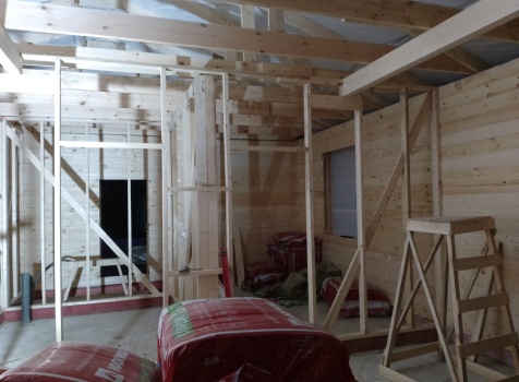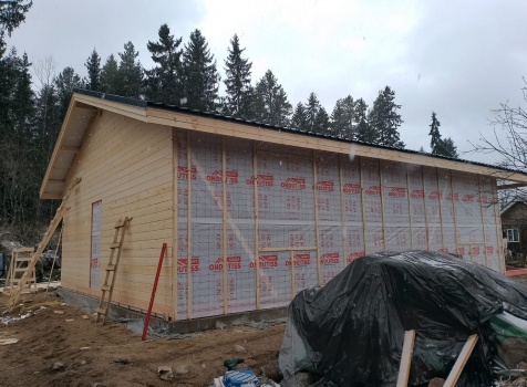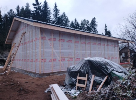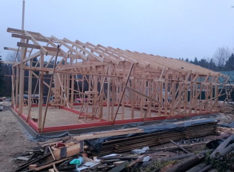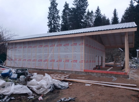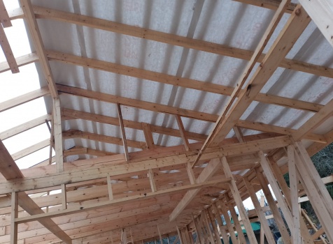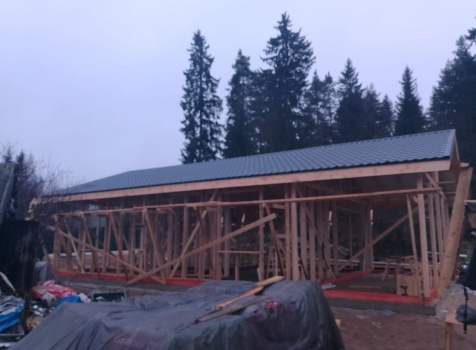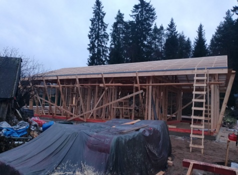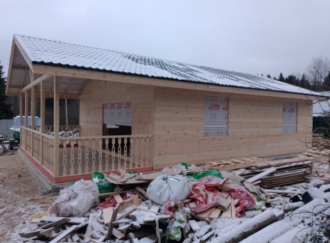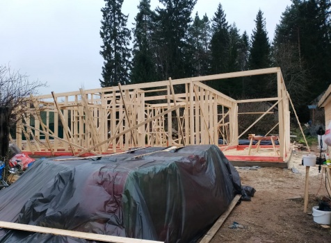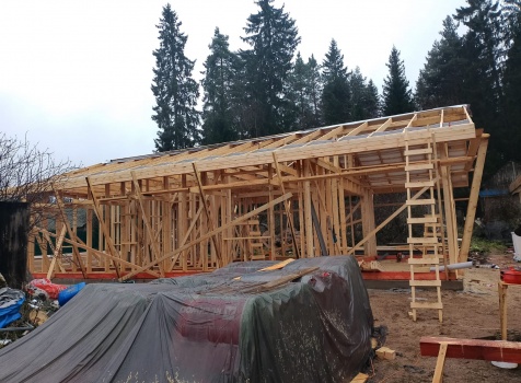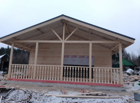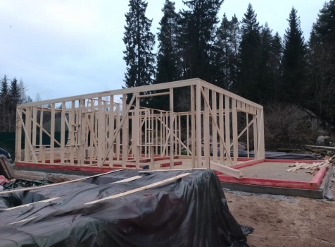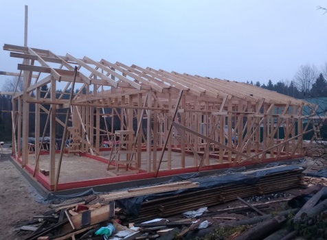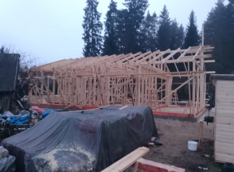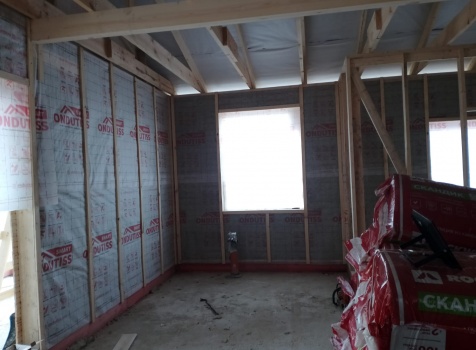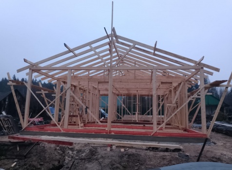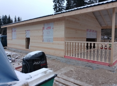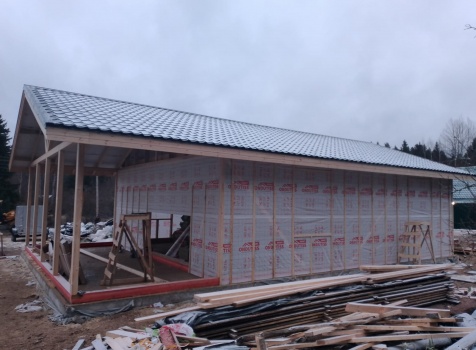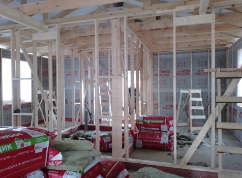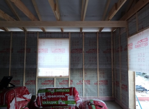 Постройка одноэтажного дома общими размерами 13.0×8.0 (10.0×8.0 дом ) каркасно-щитовой (Камерной сушки каркас ) с утеплением стен 150 мм и ( 3.0×8.0 открытая терраса ) под общей двухскатной крышей.