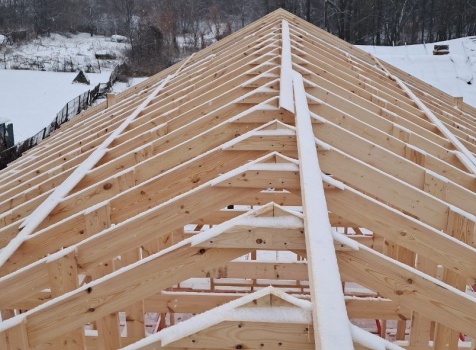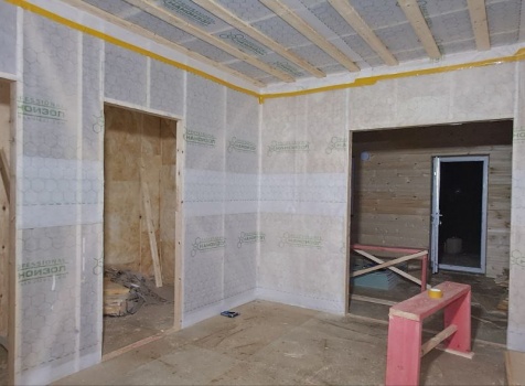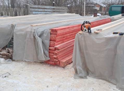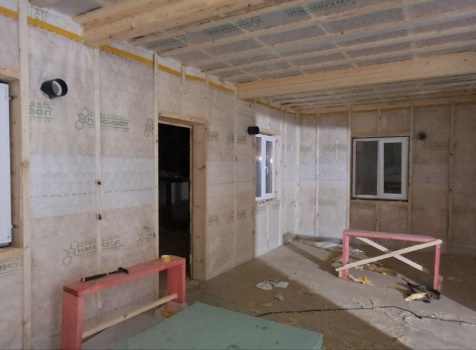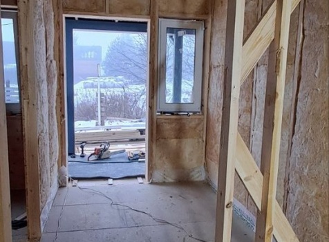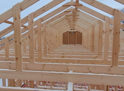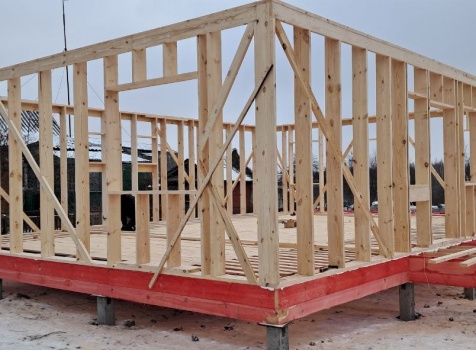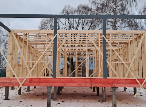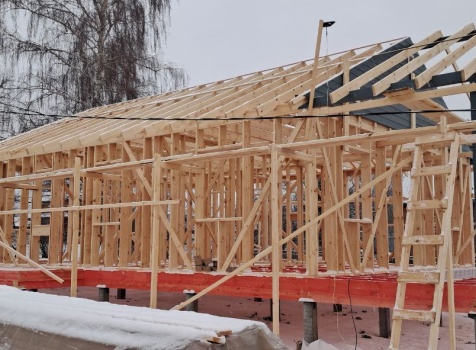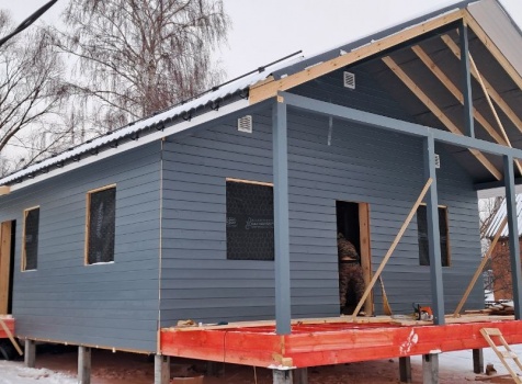 Постройка одноэтажного дома с открытой террасой и открытым крыльцом общими размерами 13.0×9.50 ( 10.50×8.0 дом ) каркасно-щитовой ( Камерной сушки ) с утеплением в 200 мм ( стены ) и ( 2.50×8.0 открытая терраса ) под общей двухскатной крышей и ( 2.0×1.50 открытое крыльцо ) под отдельной односкатной крышей