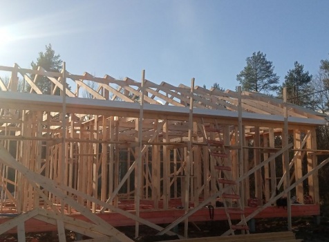 Постройка одноэтажного дома с открытой террасой и открытым крыльцом общими размерами 14.0×11.0 ( 12.0×8.0 дом ) каркасно-щитовой ( Камерной сушки ) с утеплением в 200 мм ( стены ) под двухскатной крышей и ( 6.0×3.0 открытая терраса ) под отдельной односкатной крышей и ( 2.0×3.0 открытое крыльцо ) под отдельной двухскатной крышей: https://zodchestvo53.ru/valeriya