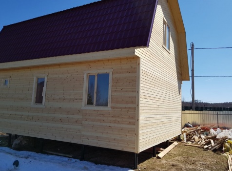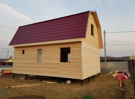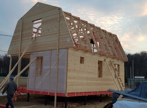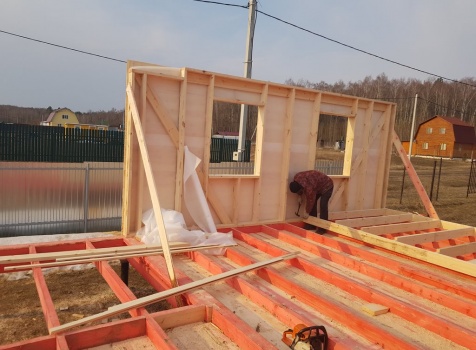 Каркасный дом общими размерами 8.0*6.0 с утеплением стен 150 мм под ломаной крышей. Объект построен: Московская область, Ступинский район, д. Волково, СНТ" ЩИТ".
