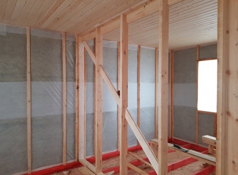 Стены первого и второго этажей: каркасно-щитовые,40*150, с утеплением Роквул,обшиваются вагонкой.
