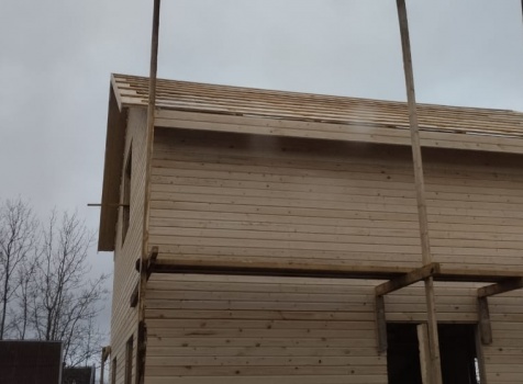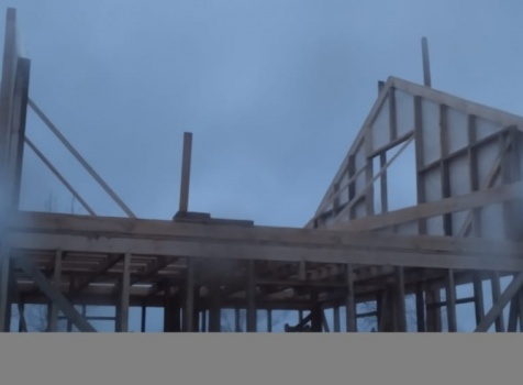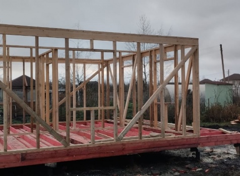 Постройка полутораэтажного дома общими размерами 7.50×6.0 (6.0×6.0 дом) каркасно — щитовой под двухскатной крышей и (1.50×6.0 открытая терраса) под отдельной односкатной крышей.