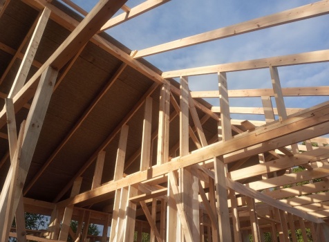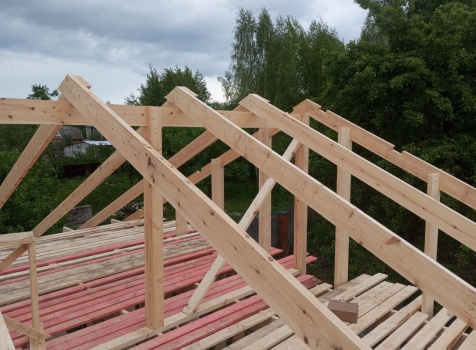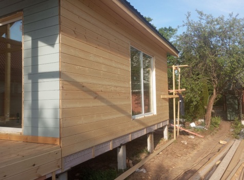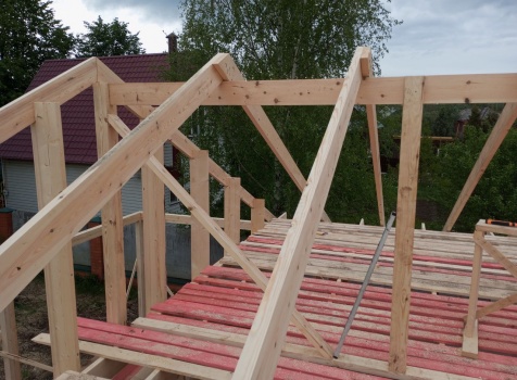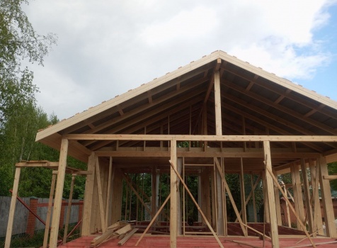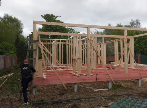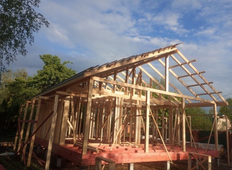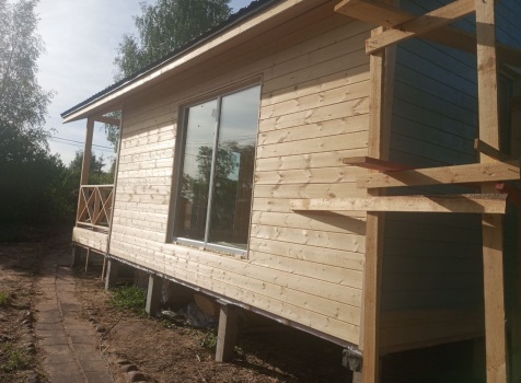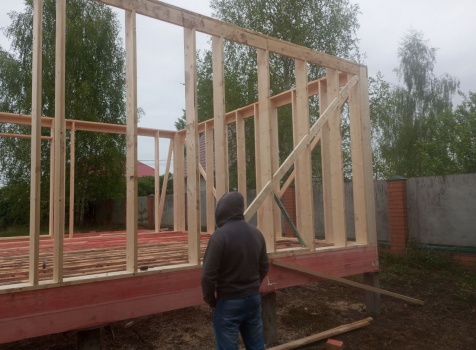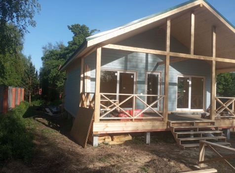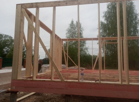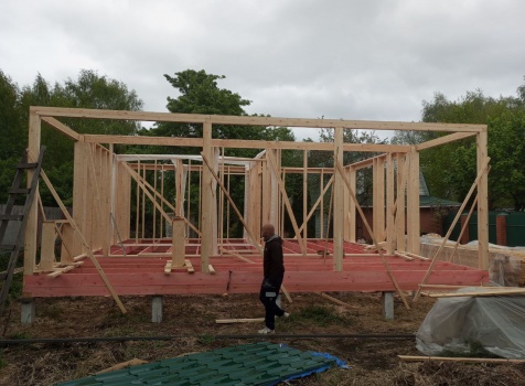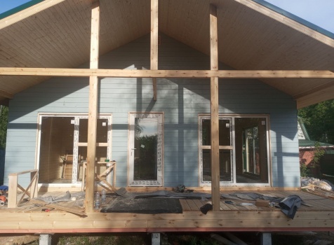 Постройка одноэтажного дома с открытой террасой общими размерами 8.0×8.50 ( 8.0×6.0 дом ) каркасно-щитовой ( Камерной сушки ) с утеплением в 200 мм ( стены ) и ( 8.0×2.50 терраса ) под общей двухскатной крышей