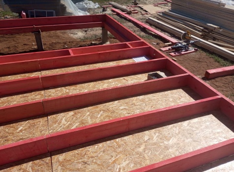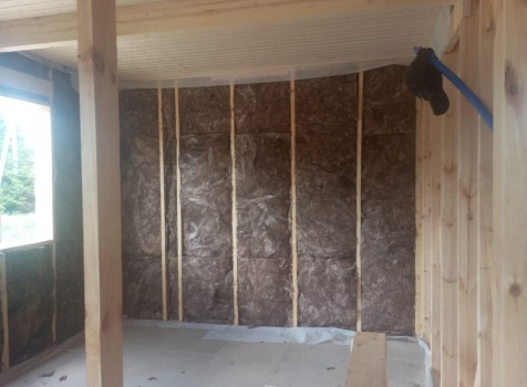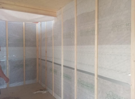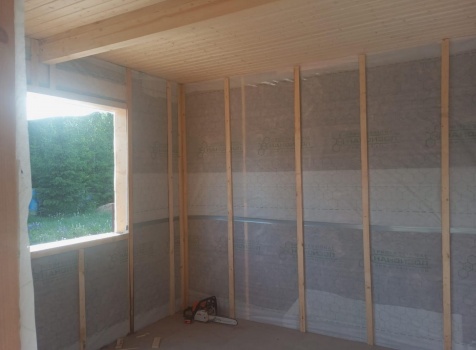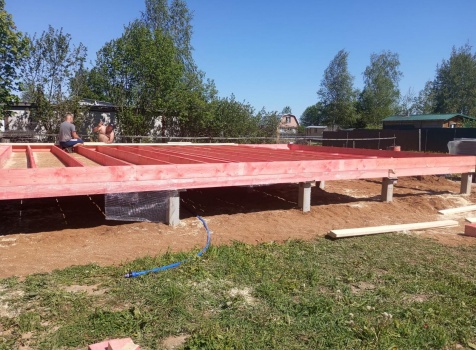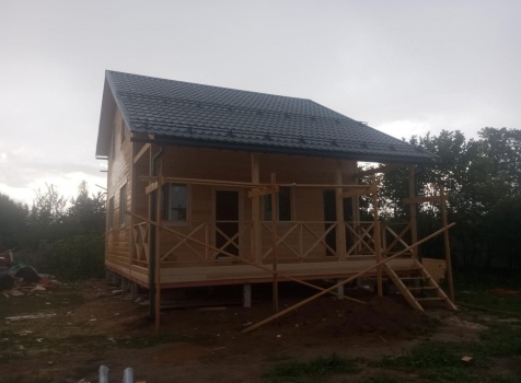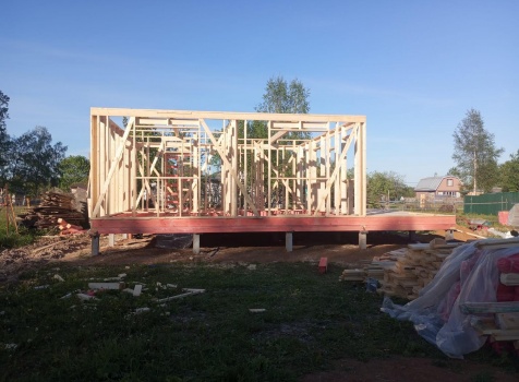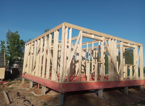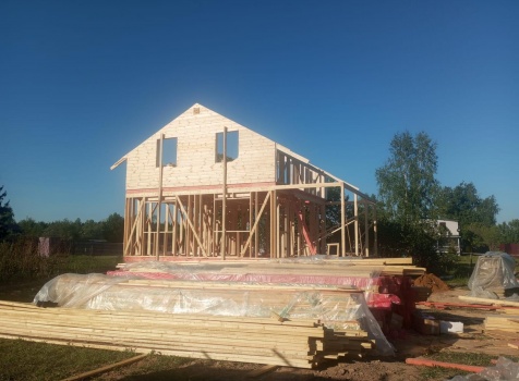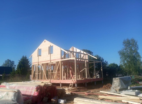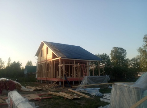 Постройка полутораэтажного дома с открытой террасой общими размерами 9.50×7.0 ( 7.0×7.0 дом полутораэтажный ) каркасно—щитовой (Камерной сушки) с утеплением в 150 мм (стены) и ( 2.50×7.0 открытая терраса ) под общей двухскатной крышей ( один скат длиннее )