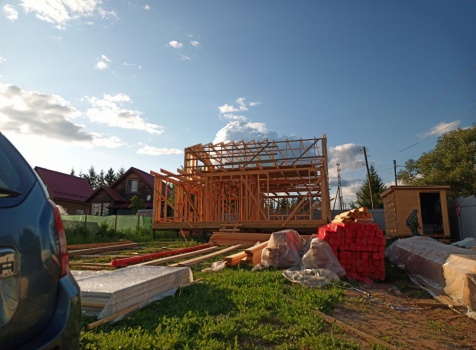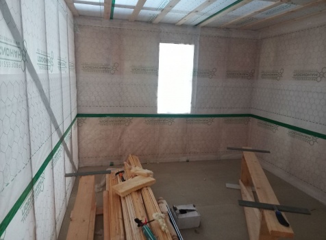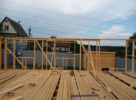 Постройка двухэтажного дома общими размерами 9.0×10.0 ( 9.0×7.0 под ломанной крышей )и ( 3.0×9.0 под отдельной односкатной крышей ) каркасно-щитовой Камерной сушки с утеплением в 150 мм ( стены )