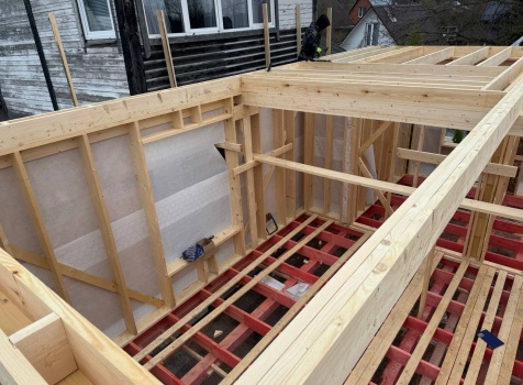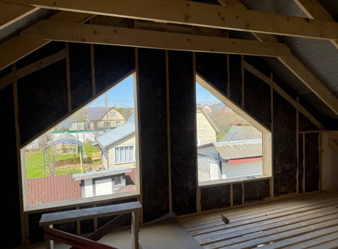 Постройка полутораэтажного дома общими размерами 9.0×7.0 каркасно-щитовой (Камерной сушки) с утеплением в 200мм (стены) под двухскатной крышей по проекту: https://zodchestvo53.ru/elena
