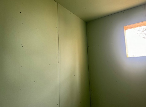 • Санузел : 1.50×2.50 . Стены обшиваются сухой строганной доской и Гипсокартоном. Потолок подшивается сухой не строганной доской. Установка окна ПВХ.
