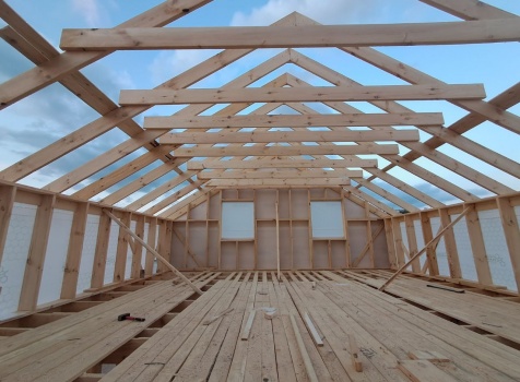 • Фронтоны на дому по 7.0 стороне ( согласно проекта ): каркасно-щитовые, обшиваются Имитацией бруса