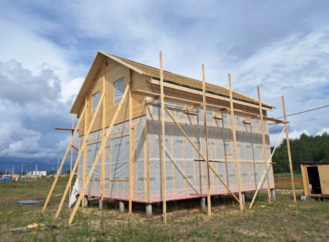 Постройка полутораэтажного дома общими размерами 9.0×7.0 каркасно-щитовой (Камерной сушки) с утеплением в 200 мм (стены) под двухскатной крышей: https://zodchestvo53.ru/bogdana