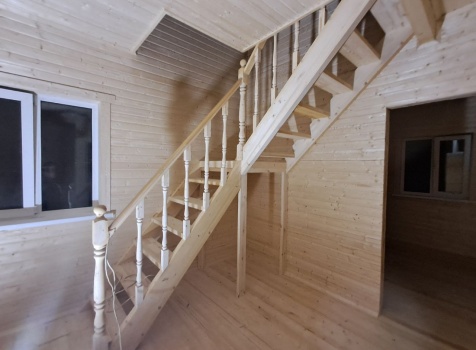• Лестница : одномаршевая с площадкой, с точеными балясинами , стартовыми столбами и перилами