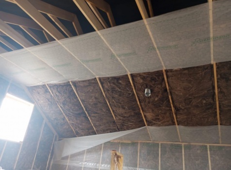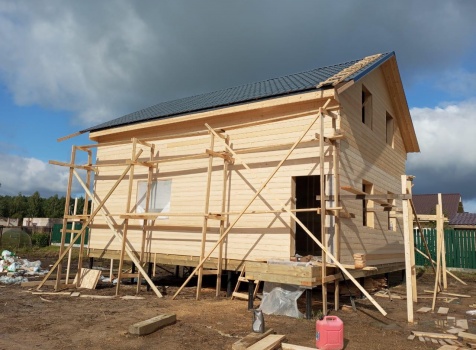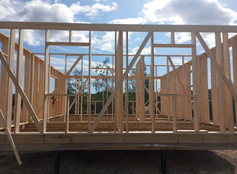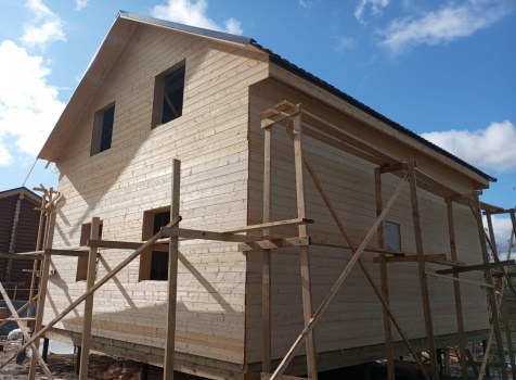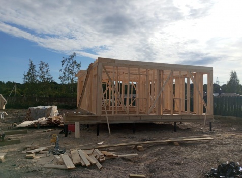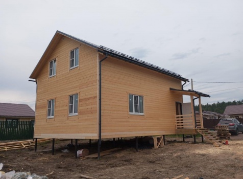 Постройка полутораэтажного дома с открытым крыльцом, общими размерами 9.0×8.50 (9.0×7.0 Дом) каркасно-щитовой (Камерной сушки) с утеплением в 200 мм (стены) под двухскатной крышей и ( 1.50×1.50 открытое крыльцо ) под отдельной односкатной крышей.