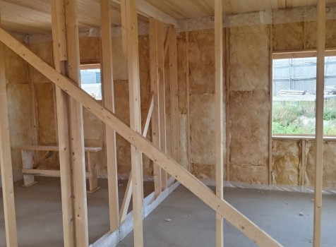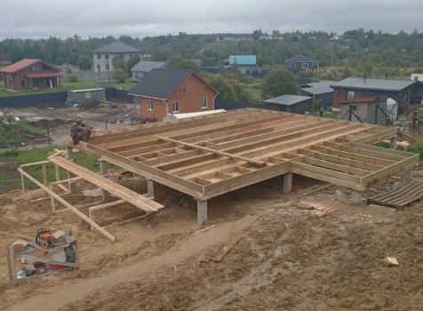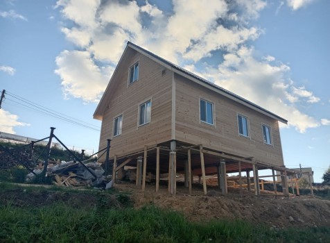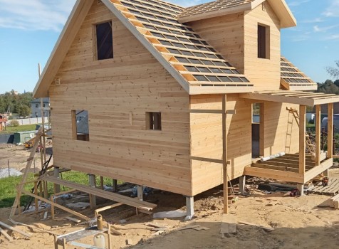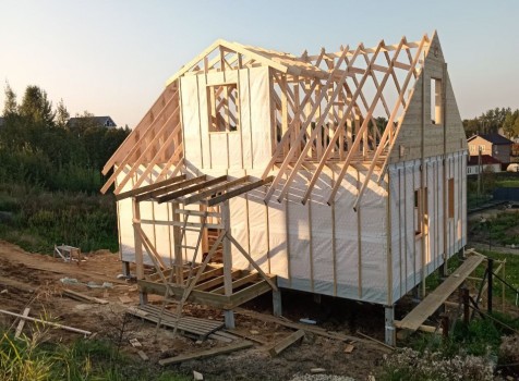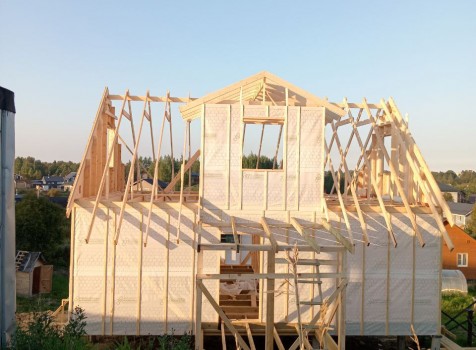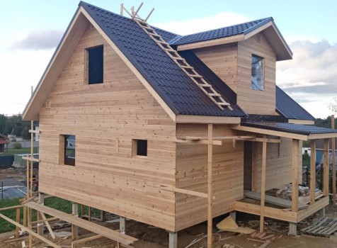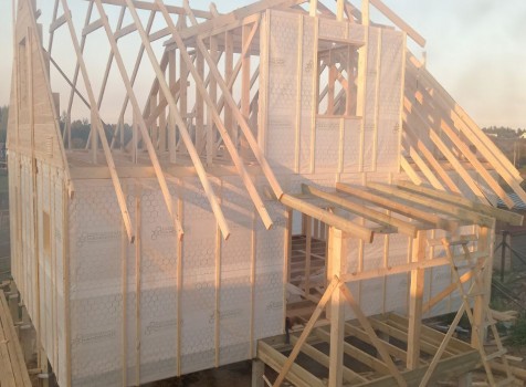 Постройка двухэтажного дома с открытой террасой, общими размерами 9.0×9.0 ( 7.0×9.0 дом ) под двухскатной крышей и ( 1.0×3.0 кукушка ) под отдельной двухскатной крышей каркасно—щитовой с утеплением в 150 мм Камерной сушки (стены) и ( 2.0×3.0 открытая терраса ) под отдельной односкатной крышей по пректу: Алина
