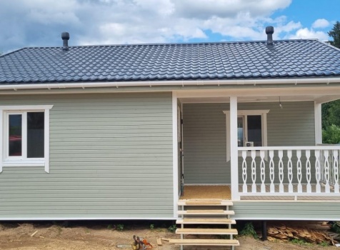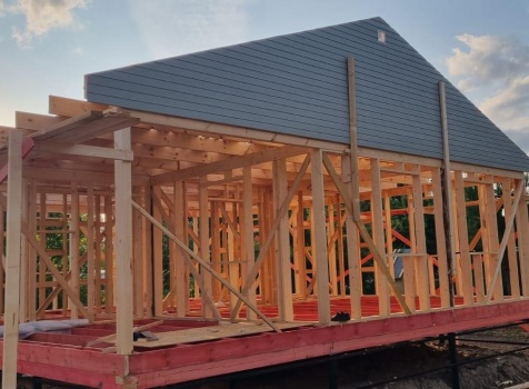 Постройка одноэтажного дома с открытой террасой общими размерами 9.0×9.0 каркасно-щитовой (Камерной сушки) с утеплением в 150 мм (стены) под двухскатной крышей