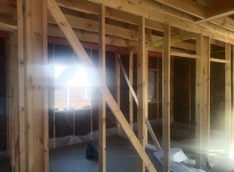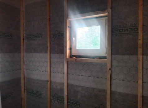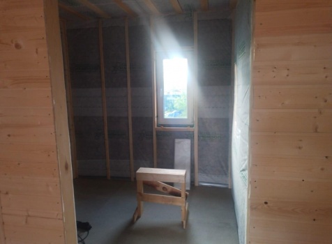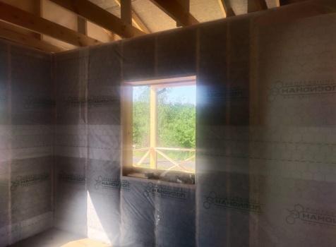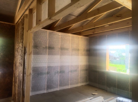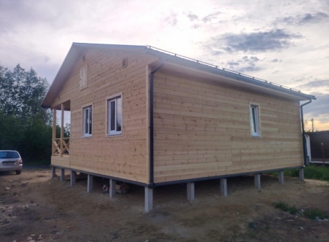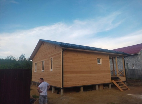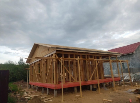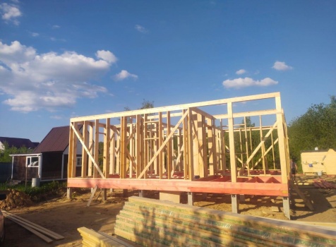 Постройка одноэтажного дома с открытой террасой общими размерами ( 9.0×9.0 каркасно-щитовой Камерной сушки с утеплением в 200 мм (стены) под двухскатной крышей по проекту : https://zodchestvo53.ru/evgeniya