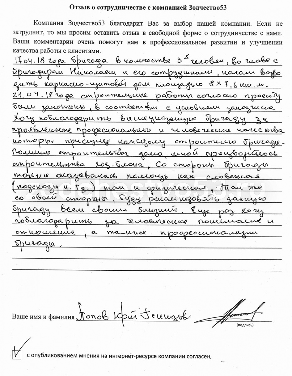 Здравствуйте. Хотелось бы поделиться впечатлением о недавно законченной стройке нашего дома. Сразу скажу, что проживаем мы во Владимирской области. Строительство дома мы задумали достаточно давно, т.е. примерные проекты у нас на руках давно. Строились мы с компанией "Зодчество 53". Отличная компания, кстати. У них и директор хороший, и сама бригада была хорошая. Ребята все отзывчивые и адекватные. К тому же профессионалы своего дела. Построили очень аккуратно и качественно. Уложились в обговоренные сроки. Проблем никаких не возникало. Небольшие изменения в проект принимали ответственно. Остались довольны результатом. Рекомендуем. Просьба к Владимиру бригаду поощрить.