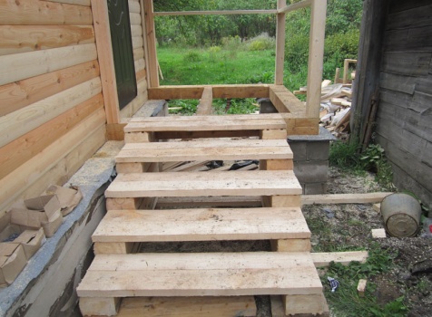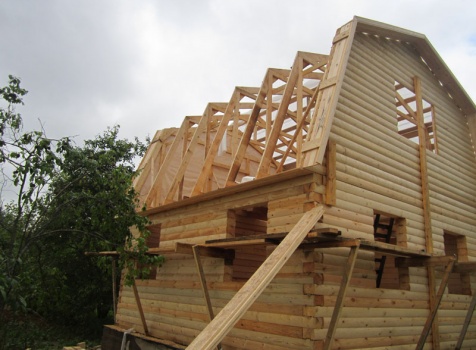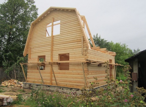 Сруб дома 6×6 м. из профилированного бруса 200×150 (овал) под ломанной крышей и открытым крыльцом 2*2 с резными балясинами под отдельной крышей. Построен в Тверской области, Калининском районе, д. Клеопино