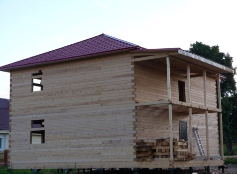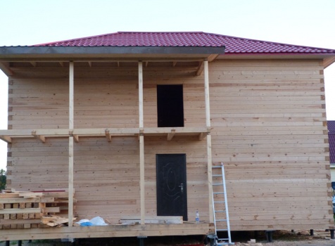 Сруб дома 8×10 м. из профилированного бруса 150×150 и терраса 1,8×6 м. первого и второго этажа под общей крышей. Построен в Ленинградской области д. Войсковицы