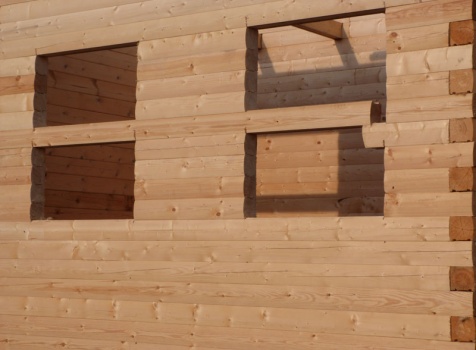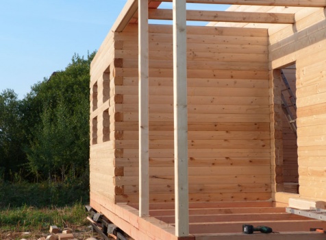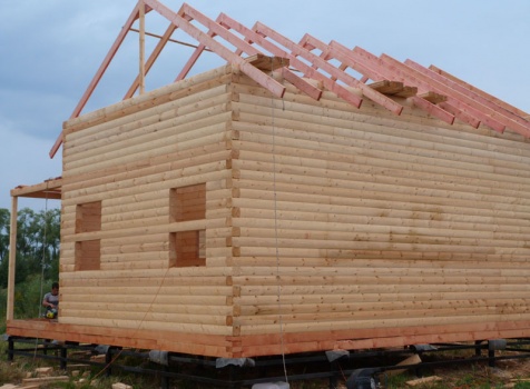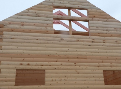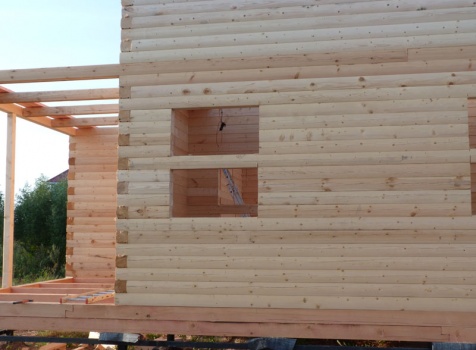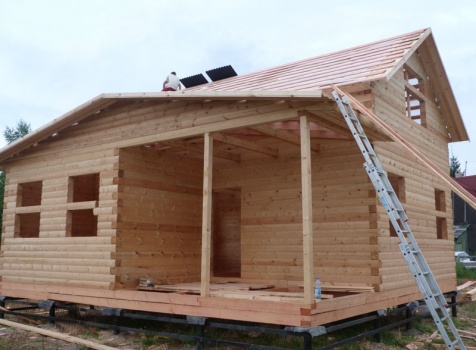 Cруб дома 8×8 по проекту Д-48 из профилированного бруса 150×150 с брусовыми фронтонами (5,5×8 дом с полуторным этажом под двухскатной крышей и веранда 2.5×8). Построен в августе 2014 г. в Ленинградской области, Ломоносовском районе, д. Верхняя Колония.