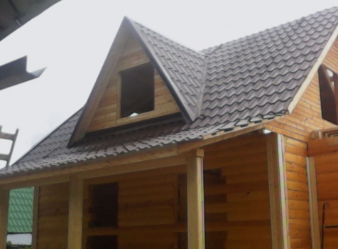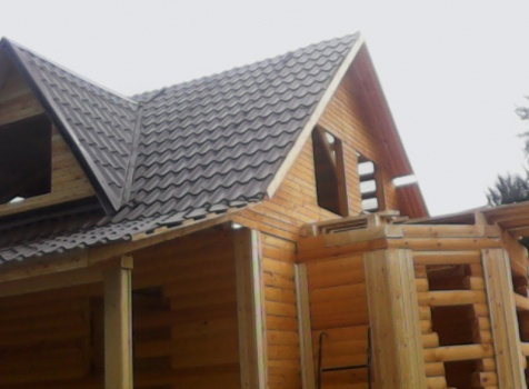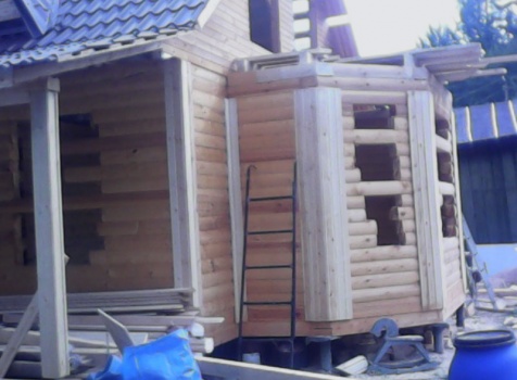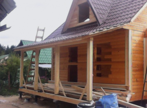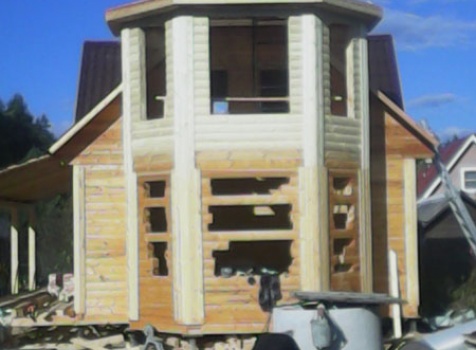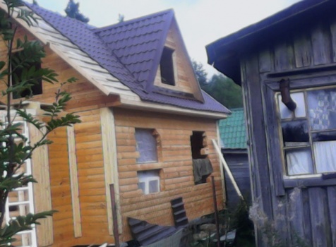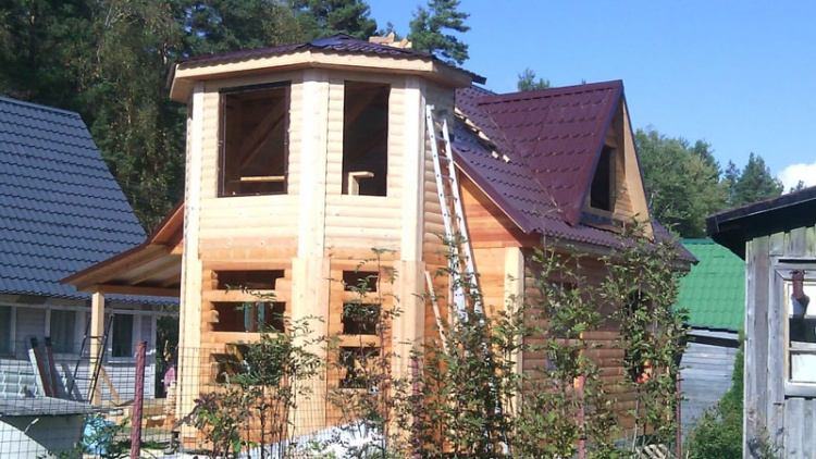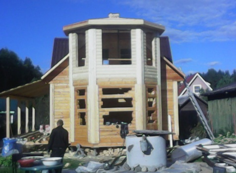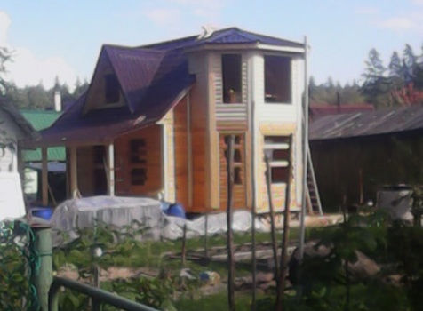Сруб дома 8×8 м. (в основе проект Д-28 с изменениями заказчика) из профилированного бруса 150×150 (6×6 сруб дома под двухскатной крышей с двумя каркасно-щитовыми кукушками (шириной 3 м., высотой 2 м.), веранда 2×6 открытая с резными балясинами под отдельной крышей и эркер 2×4м. из профилированного бруса 150×150). Построен в августе-сентябре 2014 г. в Ленинградской области, Выборгском районе, Красносельском сельском поселении.